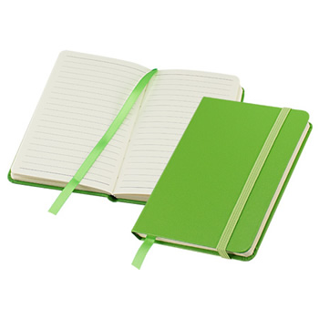 Libreta tipo "Colorskine" tamaño A6, con cubierta de cartón piedra forrada en PU (cuero sintético) de color de 1.5mm de espesor. Interior 80 hojas lineadas amarillas de 80gsm. Incluye banda elástica y huincha separadora.