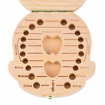 Se utiliza para el almacenamiento de los dientes de los niños y el cabello lanugo. Hecho de madera natural, resistente a la corrosión y duradero, permite guardar los dientes durante mucho tiempo. Dimensiones: 13 x 12,5 x 3 cms, almacena los dientes de leche ordenadamente.